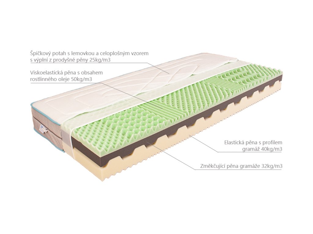A quality sandwich mattress with a seven-zone profile and viscoelastic - lazy foam with a proportion of vegetable oil. Viscoelastic foam changes its stiffness when in contact with body temperature. The high profile core improves the elasticity and breathability of the mattress. For the production of the core, we used foams with a weight of 32 kg and 40 kg/m3. The core of the mattress is protected by the separation fabric. The cover is washable at 60°C. For easier handling and washing, the cover can be divided into two halves with a zipper. The mattress is suitable for a slatted grid as well as a solid base.