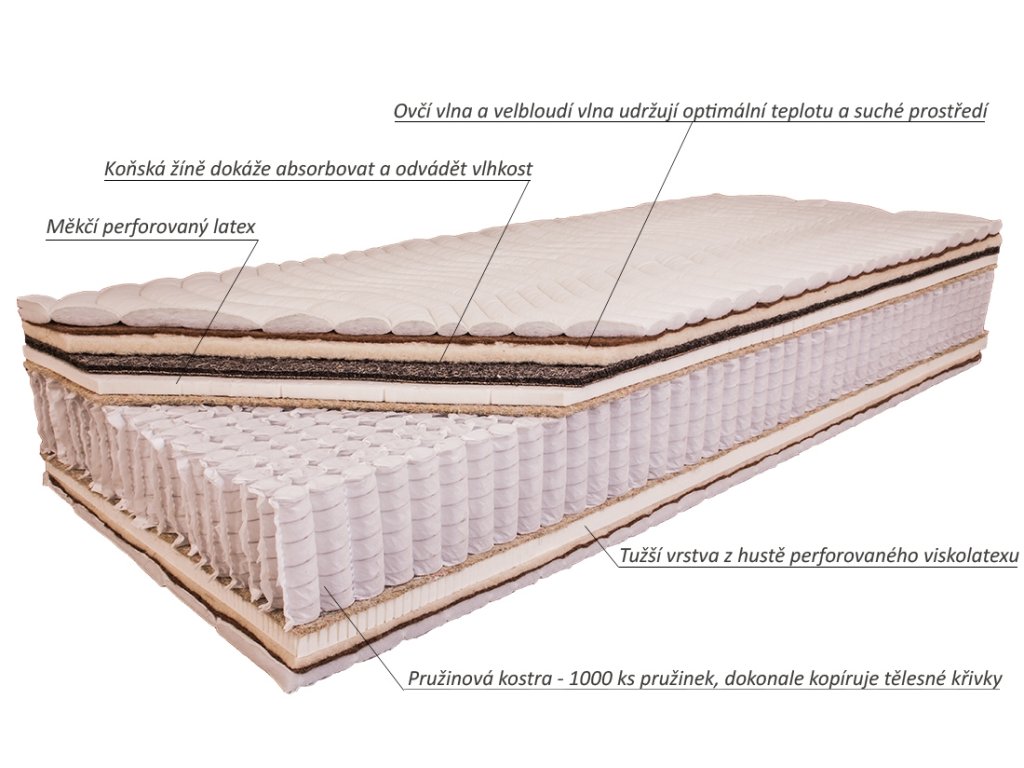 Inside there are only selected natural materials that we have prepared for the production of luxury mattresses. Densely perforated latex sheets with increased grammage, durable and breathable sisal, horsehair with high grammage without unnecessary rubber binder, 500gr pure selected wool, camel wool and finally a layer of viscose with kapok. All this on a high-quality 15 cm high pocket spring (1000 pcs) offers the user an extraordinary feeling of luxurious rest. Natural materials will ensure an optimal microclimate, absorb moisture and maintain a pleasant temperature.