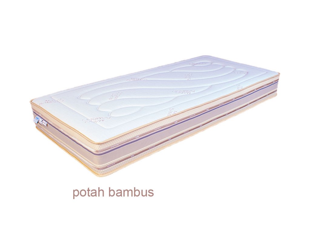 Bambus - vrchní látka s bambusovým vláknem, jež je extrahováno přímo z bambusového stébla dodává potahu příjemnou měkkost a zároveň i vyšší pevnost. Bambusové vlákno dokáže ve větší míře přijímat vlhkost a následně při změně podmínek uvolňovat do ovzduší. Bambus vytváří také účinnou bariéru proti bakteriím. Výška matrace v potahu Bambus (↨ 34 cm)
