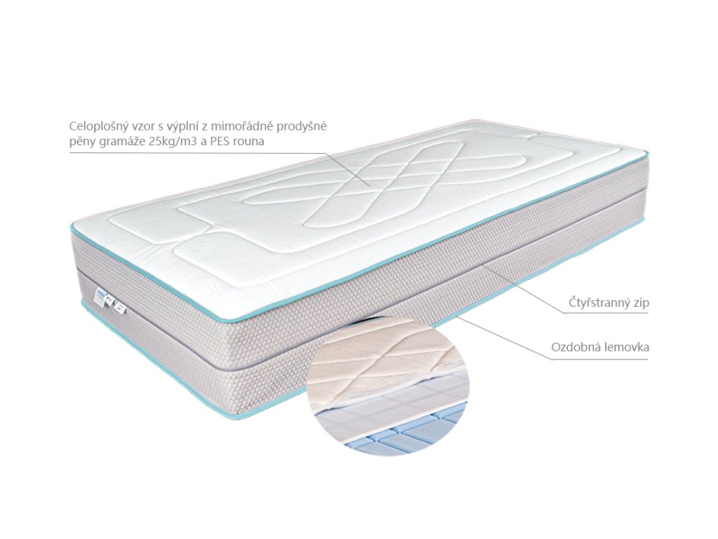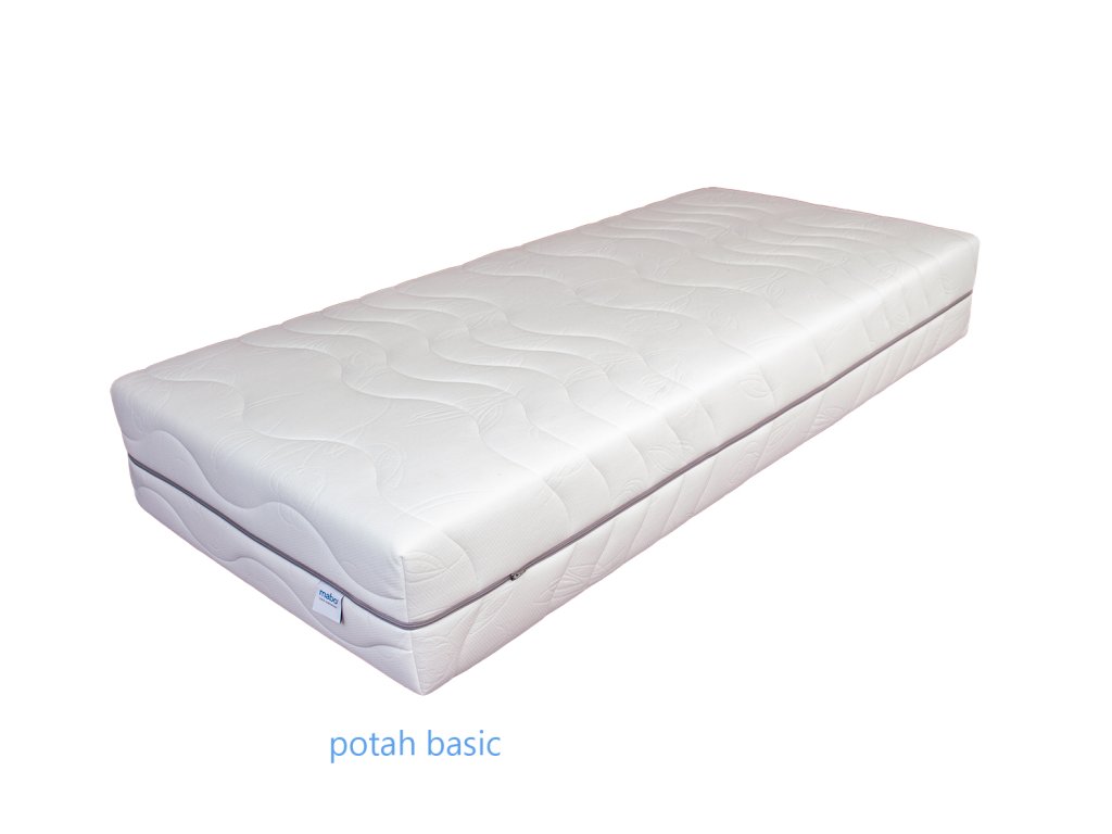 Basic - potah s vysokým obsahem bavlny Ba 30%/PES 70%. Bavlna je příjemná na omak a výborně absorbuje vlhkost. Potah matrace je vybaven zipem pro snazší praní a manipulaci. Plošný prošev PES rounem. Pratelný na max 60ºC. Výška matrace v potahu Basic (↨ 21 cm)