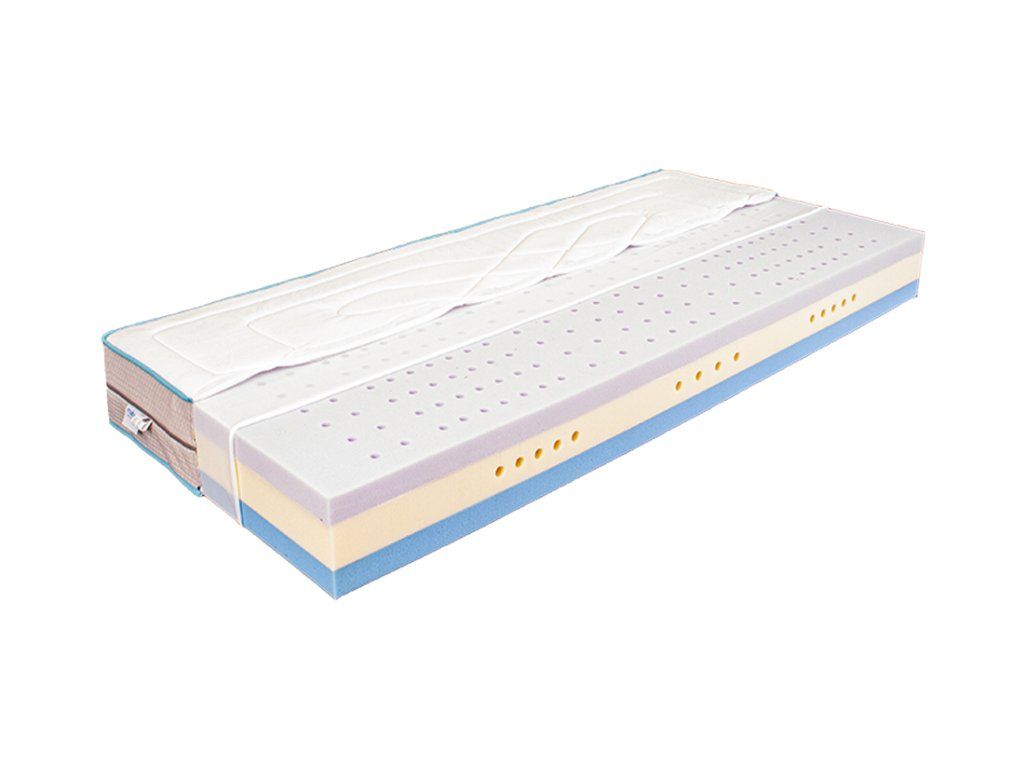 Velmi pohodlná sedmi-zónová matrace s unikátním děrováním jádra. Jádro této matrace tvoří dvě vrstvy HR studené pěny gramáže 43 kg/m3. Lze zvolit měkčí stranu matrace – fialovou nebo tužší – modrou. Střed matrace je zpevněn kvalitní PUR pěnou gramáže 40 kg s vyšší tuhostí. Jádro matrace je provrtáno skrz všemi materiály. Tím je dosaženo ideální prodyšnosti, která udržuje jádro matrace hygienicky čisté. Hustotou děrování jsou vytvořeny na matraci anatomické zóny. Jádro je opatřeno separačním úpletem.